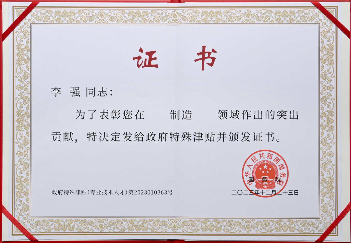 2024/8/23 | 来自:hwdz近日,公司副总经理李强获授2023年国务院政府特殊津贴。国务院政府特殊津贴是中华人民共和国国务院对于具有良好的职业道德和敬业精神,模范履行岗位职责,为社会主义现代化建设事业努力工作的高层次专业技术人才和高技能人才的一种奖励制度。享受政府特殊津贴人员是我国推动科技创新、推动技术进步、推动社会高质量发展的骨干人才力量。